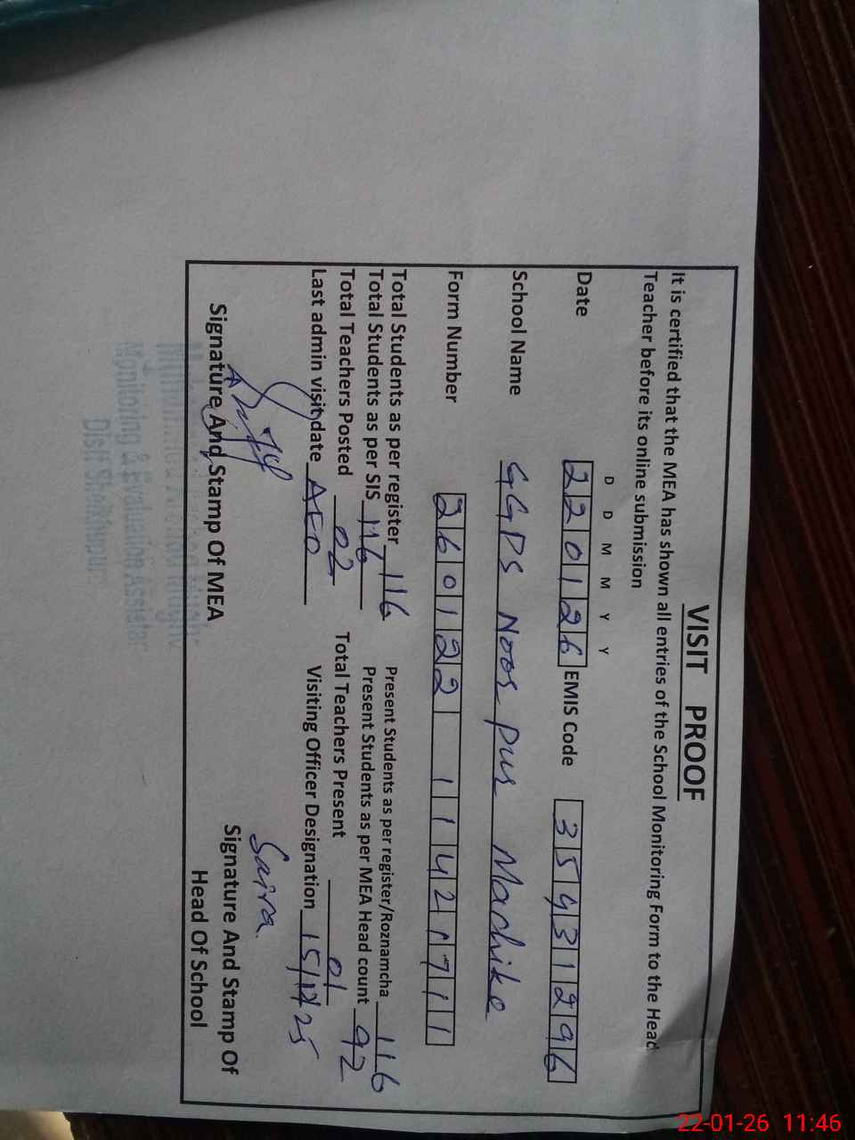 | Attendance Register | Head Teacher | MEA with School | Visit Proof |