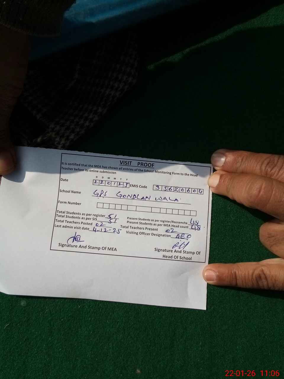| EMIS Code: 35620604 | Name of School: GPS GONDLAWALA CHAK 20 RB | |||