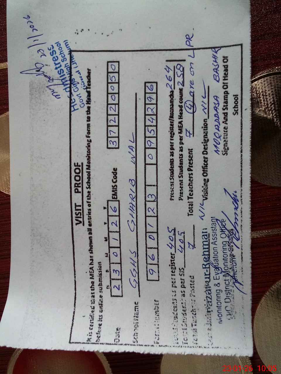 | Attendance Register | Head Teacher | MEA with School | Visit Proof |