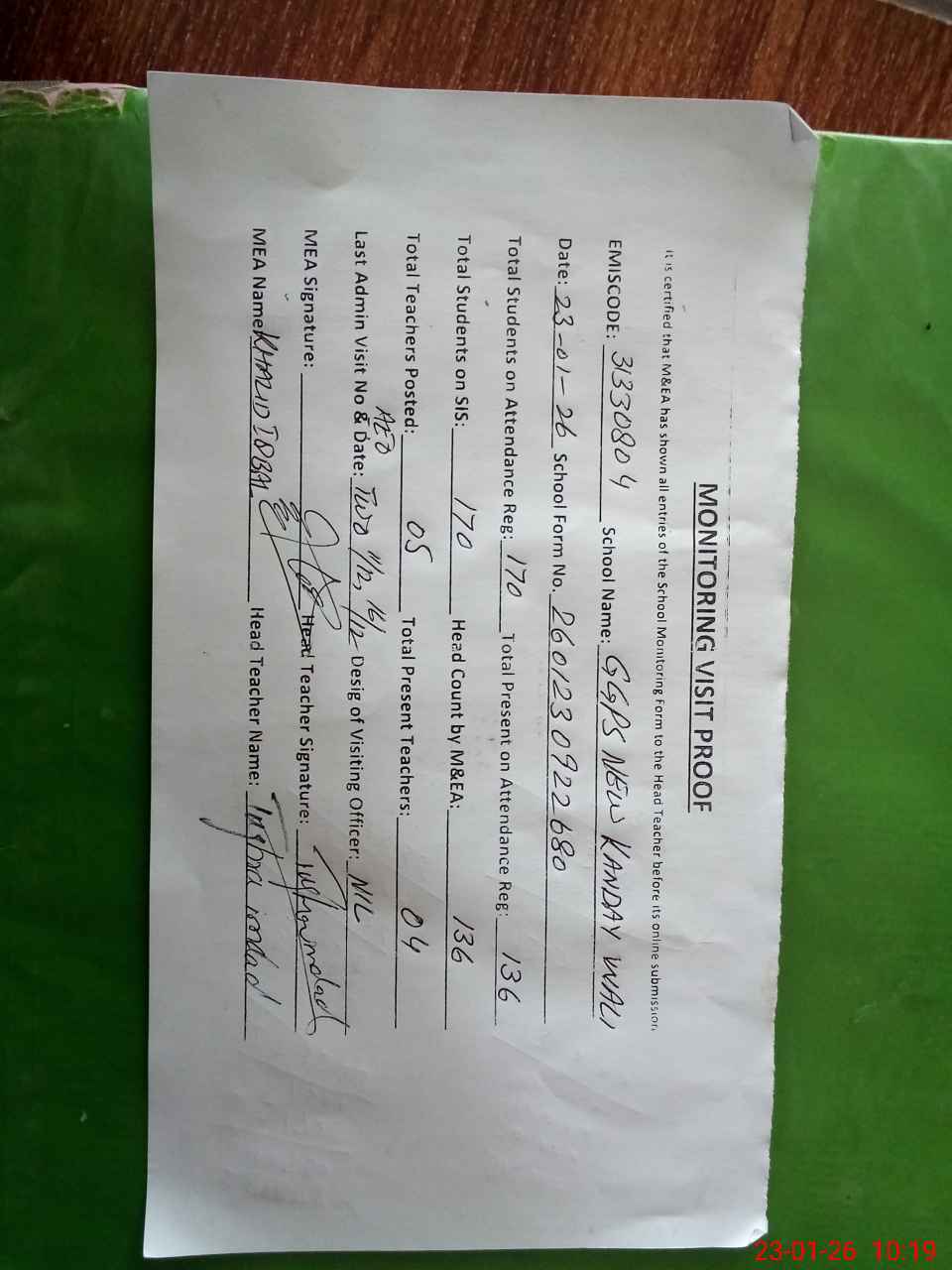 | Attendance Register | Head Teacher | MEA with School | Visit Proof |