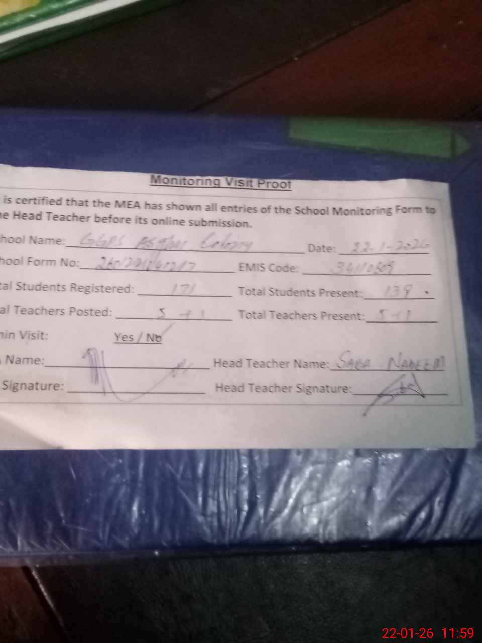 | Attendance Register | Head Teacher | MEA with School | Visit Proof |