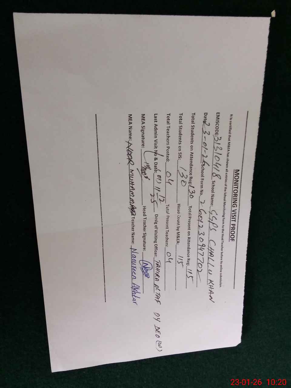 | Attendance Register | Head Teacher | MEA with School | Visit Proof |