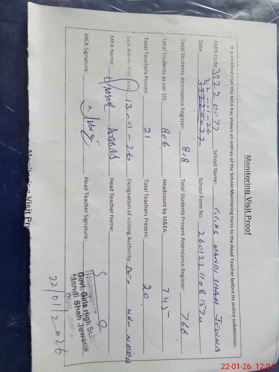 | EMIS Code: 33220077 | Name of School: GGHS MANDI SHAH JEWNA | |||