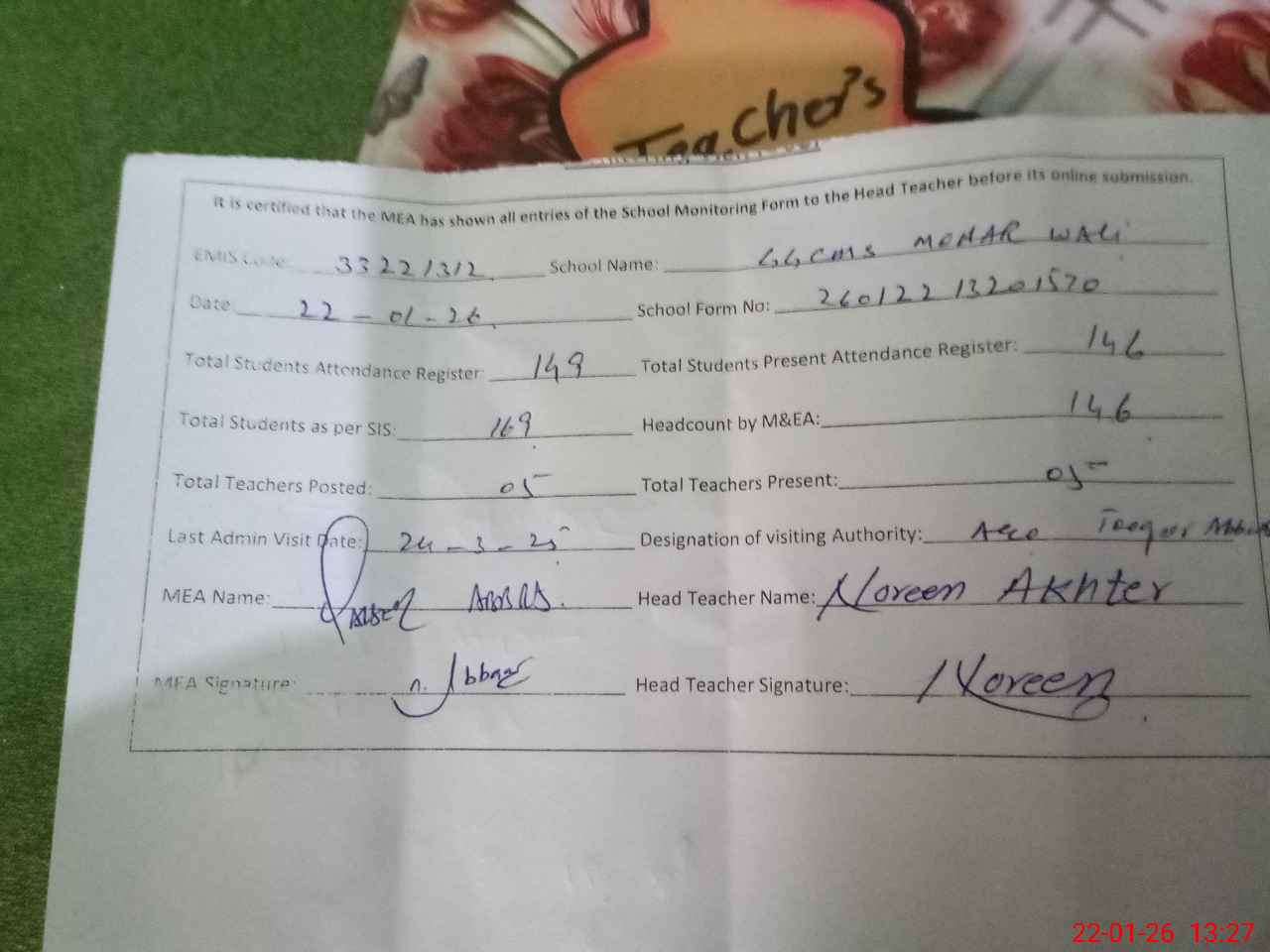 | Attendance Register | Head Teacher | MEA with School | Visit Proof |