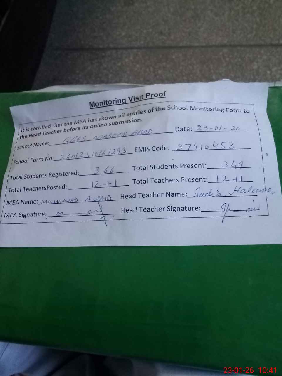 | Attendance Register | Head Teacher | MEA with School | Visit Proof |