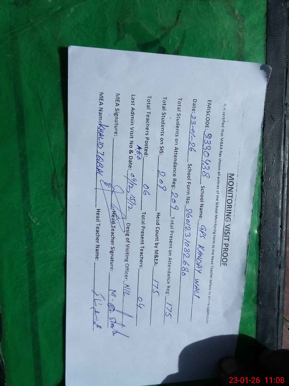 | Attendance Register | Head Teacher | MEA with School | Visit Proof |
