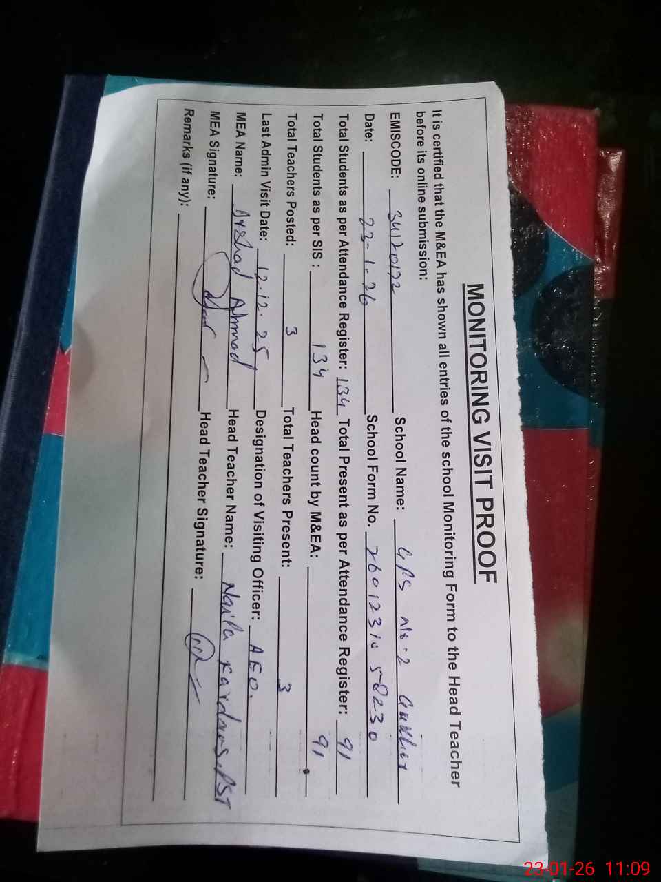 | Attendance Register | Head Teacher | MEA with School | Visit Proof |