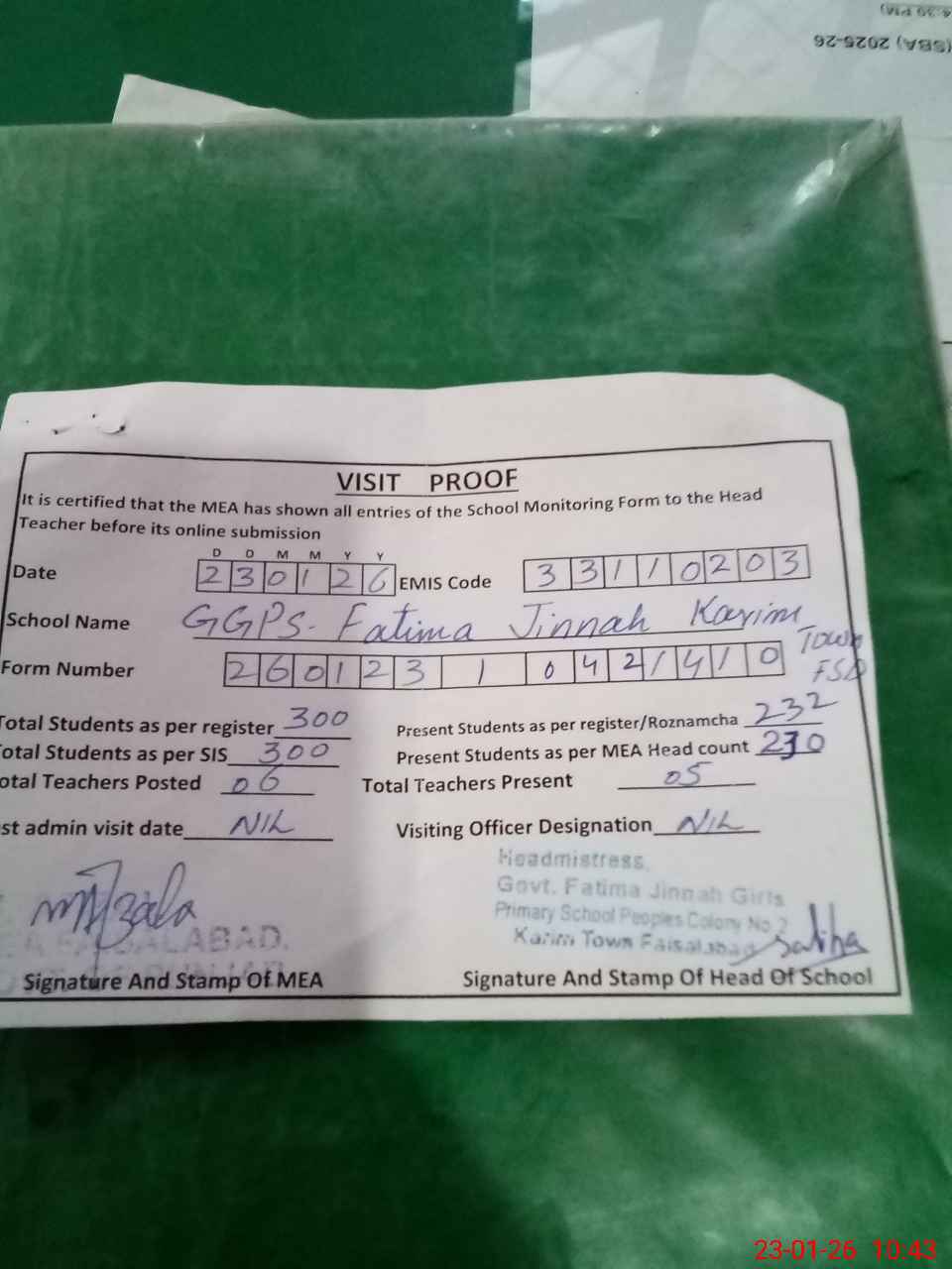 | EMIS Code: 33110203 | Name of School: GGPS FATIMA JINNAH KARIM TOWN FSD | |||