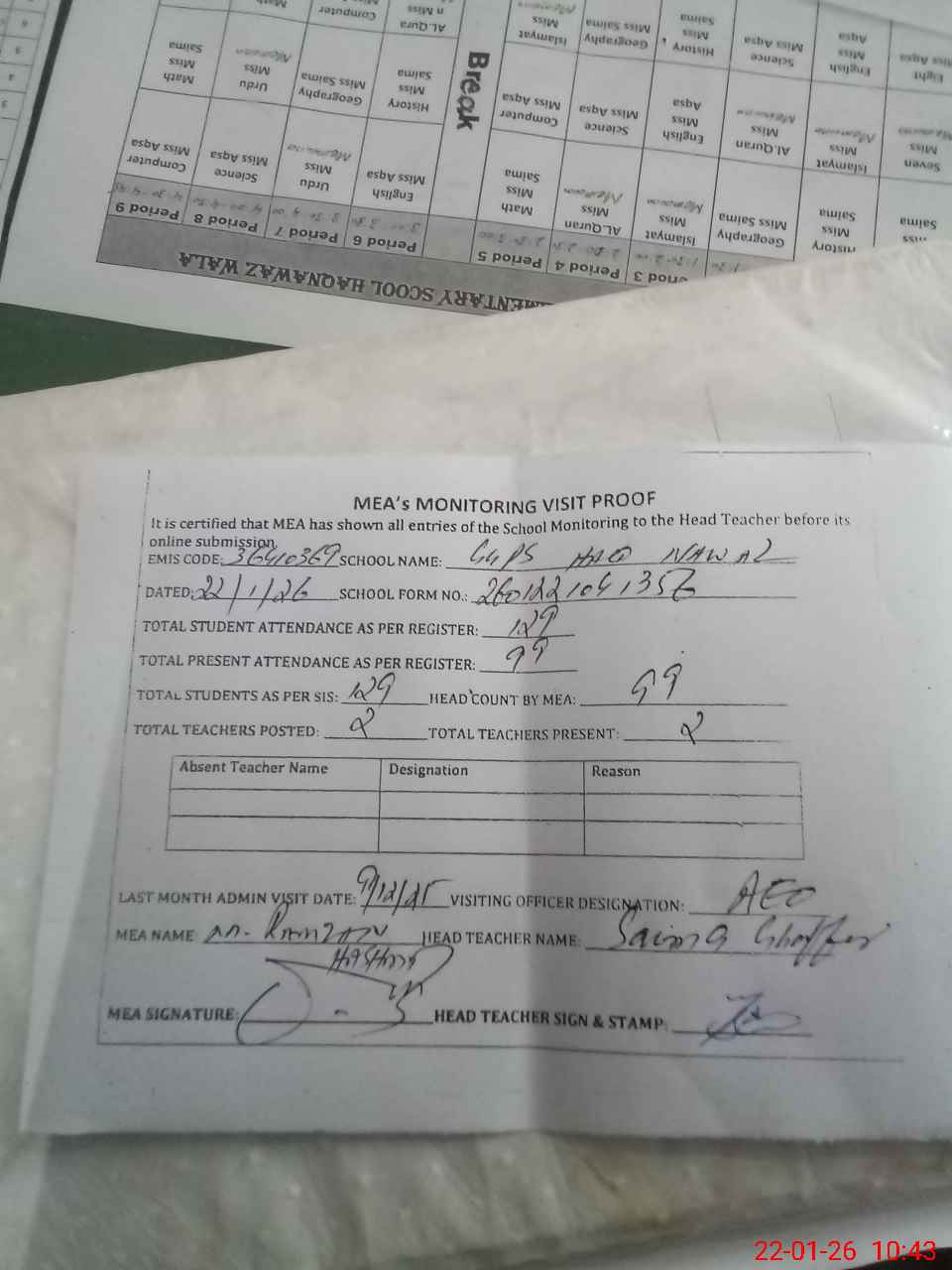 | Attendance Register | Head Teacher | MEA with School | Visit Proof |