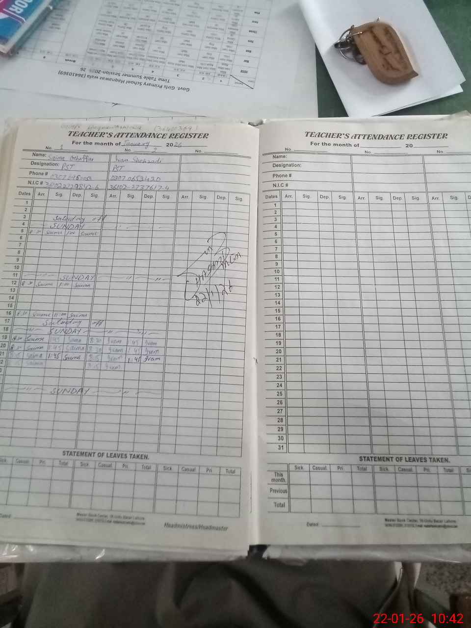 | CNIC | Full Name | Designation | R/C | Absence During Last Calender Month |