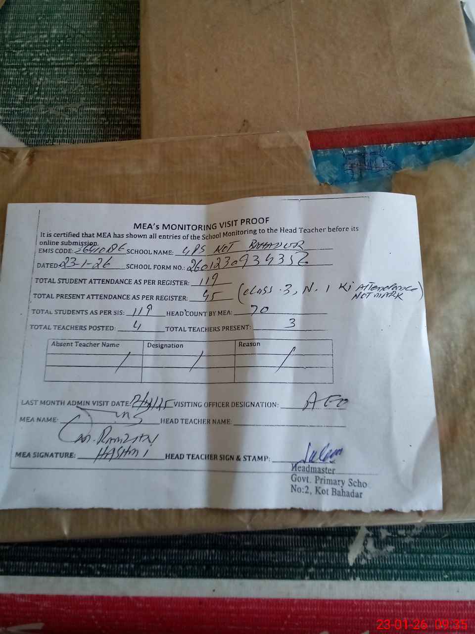 | Attendance Register | Head Teacher | MEA with School | Visit Proof |