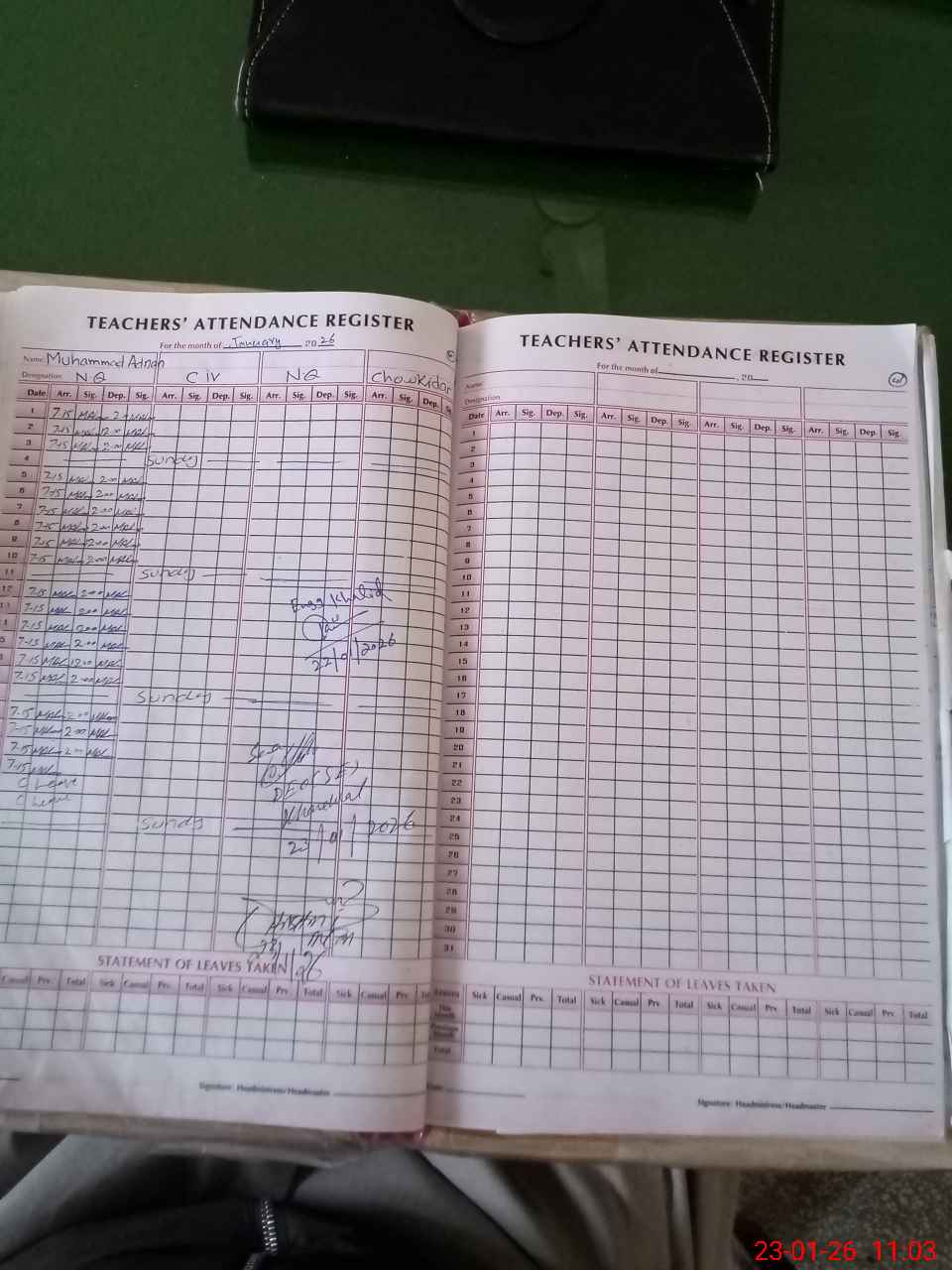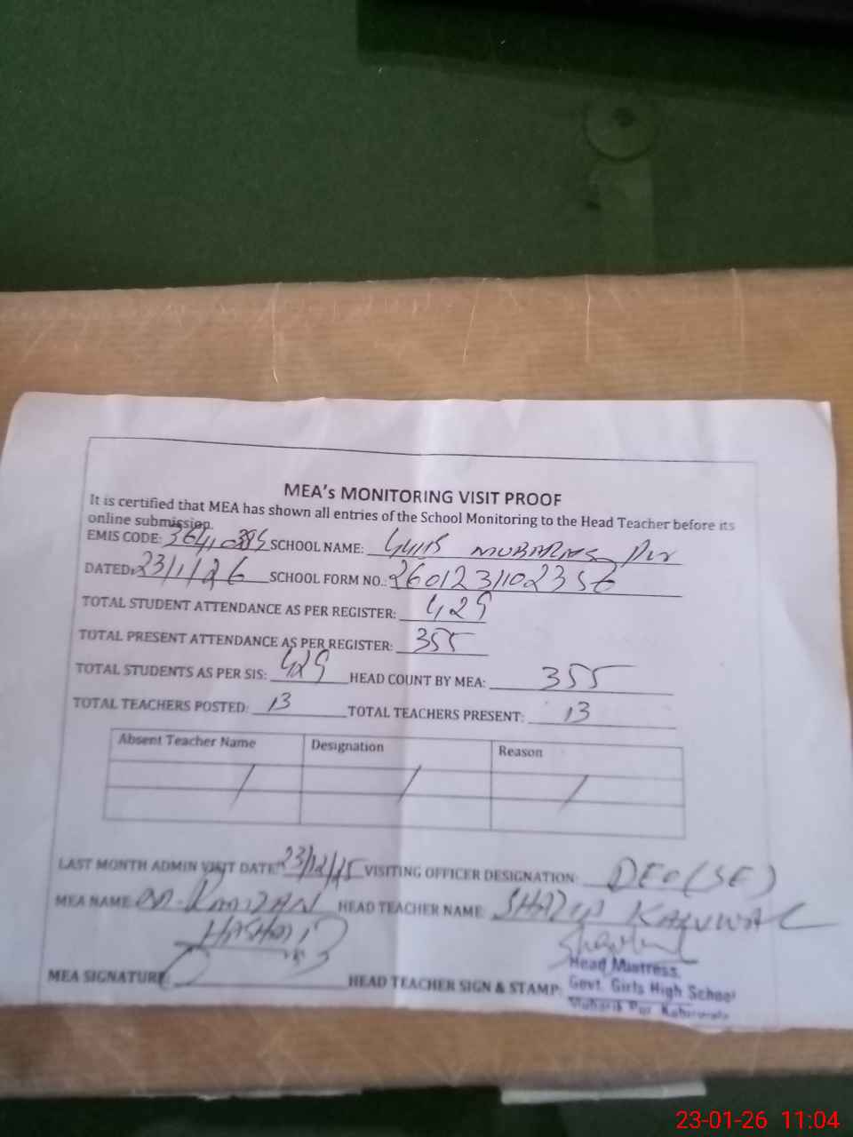 | Attendance Register | Head Teacher | MEA with School | Visit Proof |