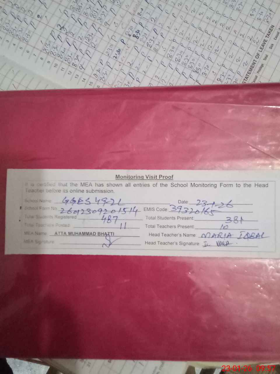 | Attendance Register | Head Teacher | MEA with School | Visit Proof |