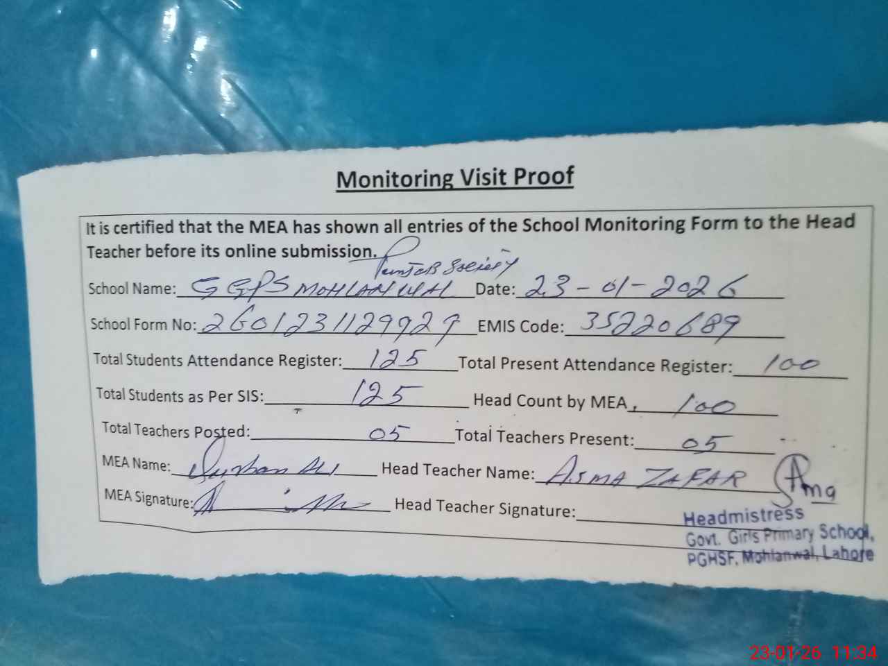 | Attendance Register | Head Teacher | MEA with School | Visit Proof |