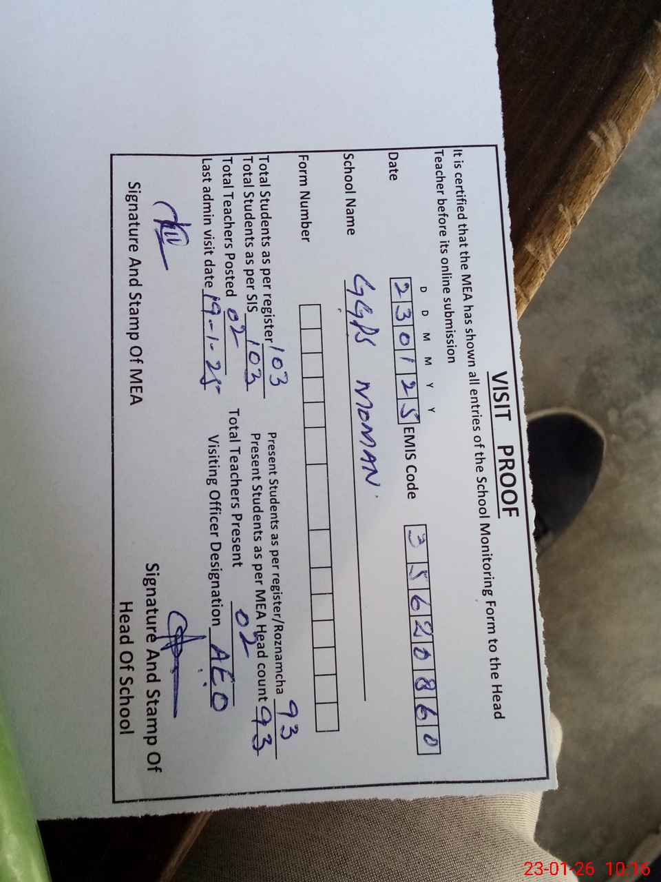 | Certified that this School was Inspected by the Undersigned MEA/DMO Today and the Information Stated Above is as Per Record. | |||||