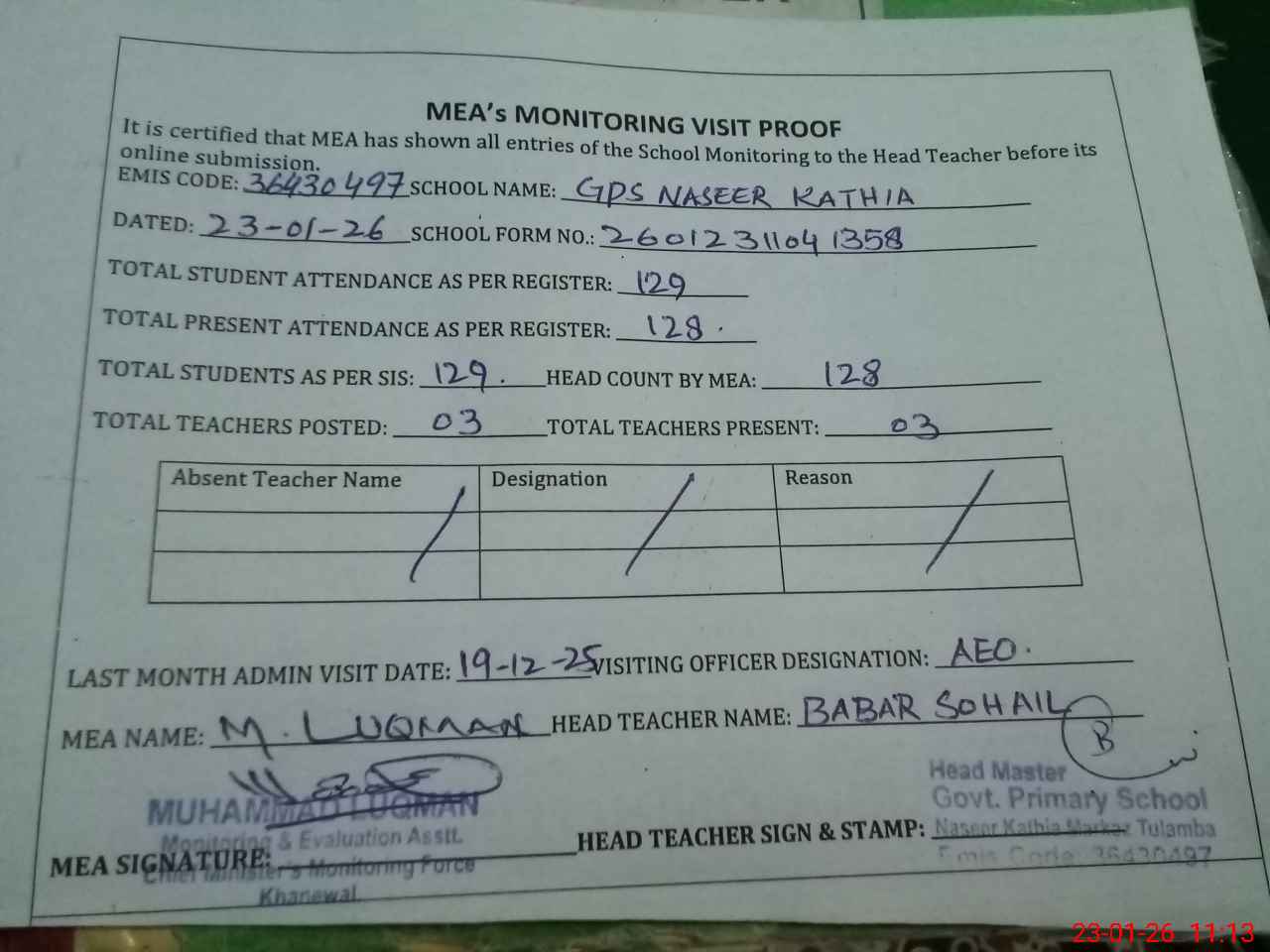 | Attendance Register | Head Teacher | MEA with School | Visit Proof |
