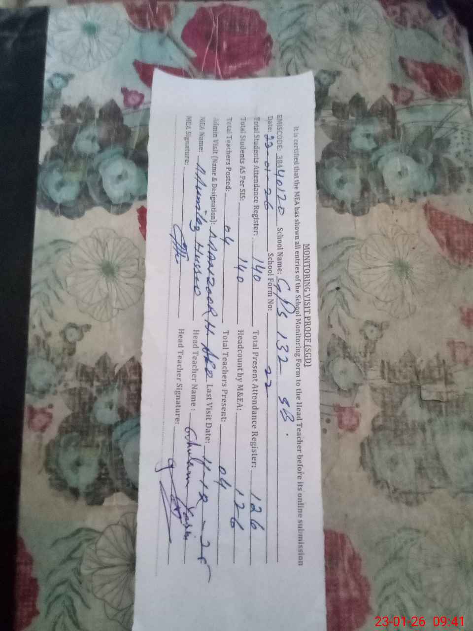| Attendance Register | Head Teacher | MEA with School | Visit Proof |