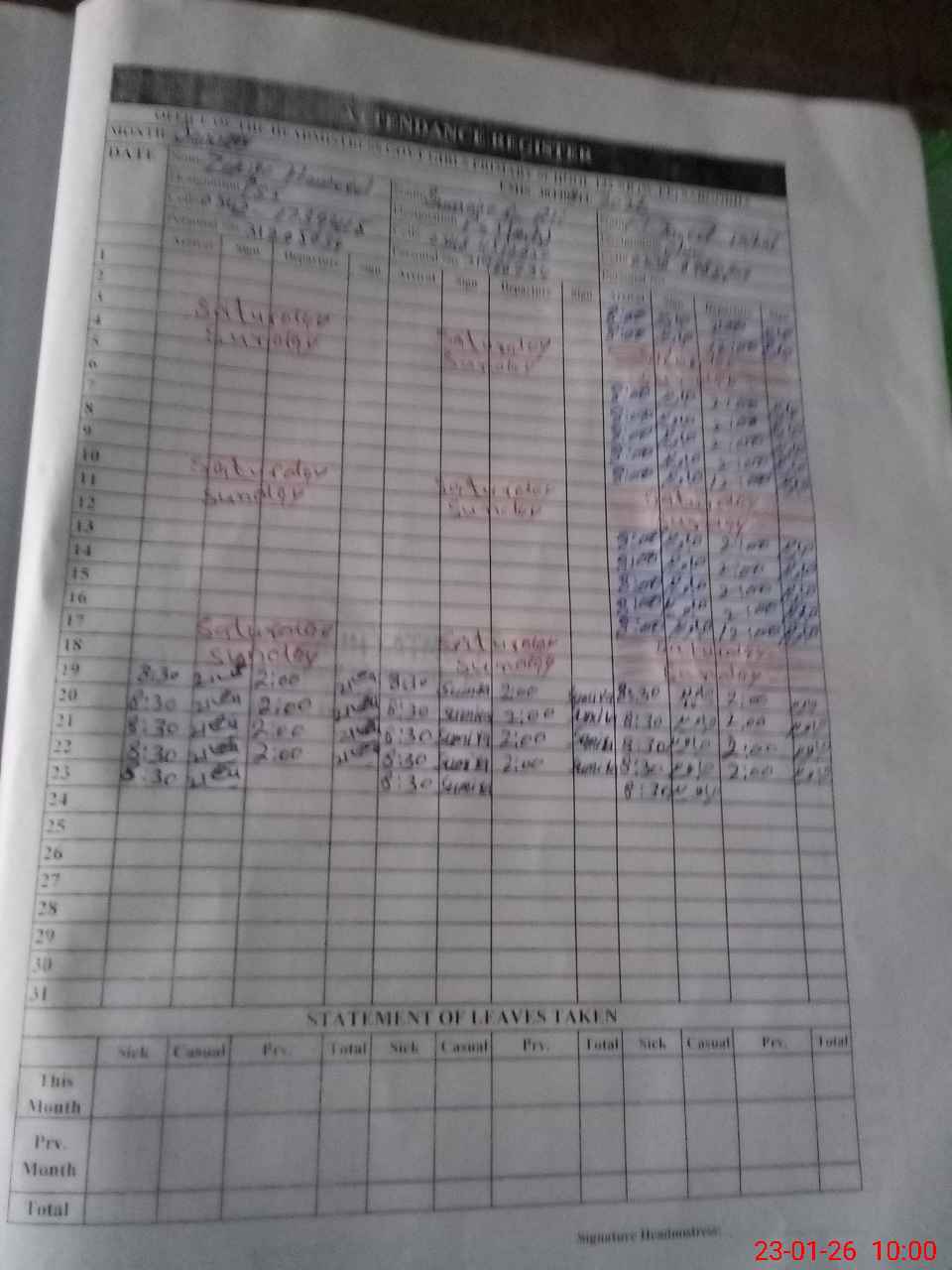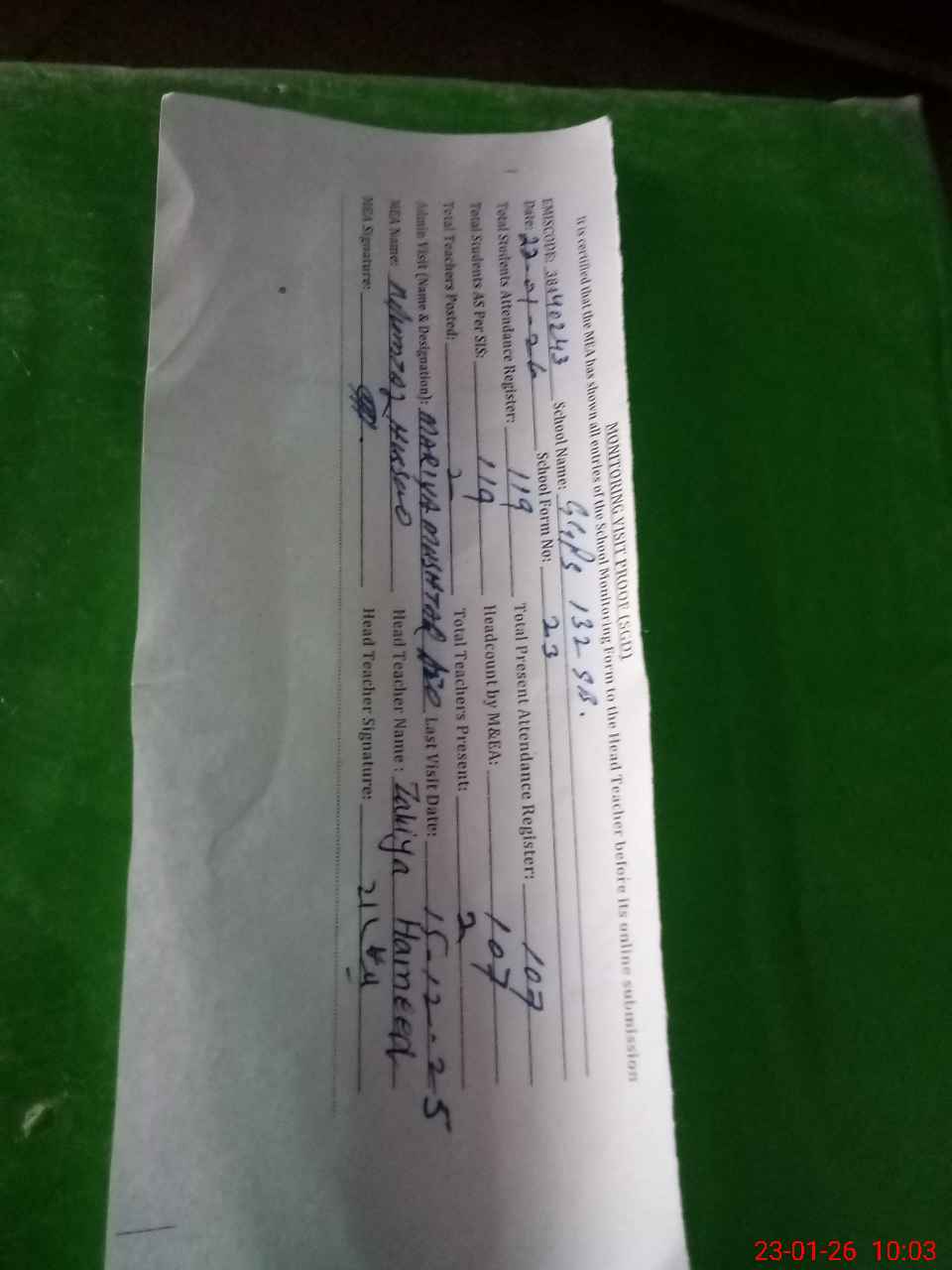| Attendance Register | Head Teacher | MEA with School | Visit Proof |