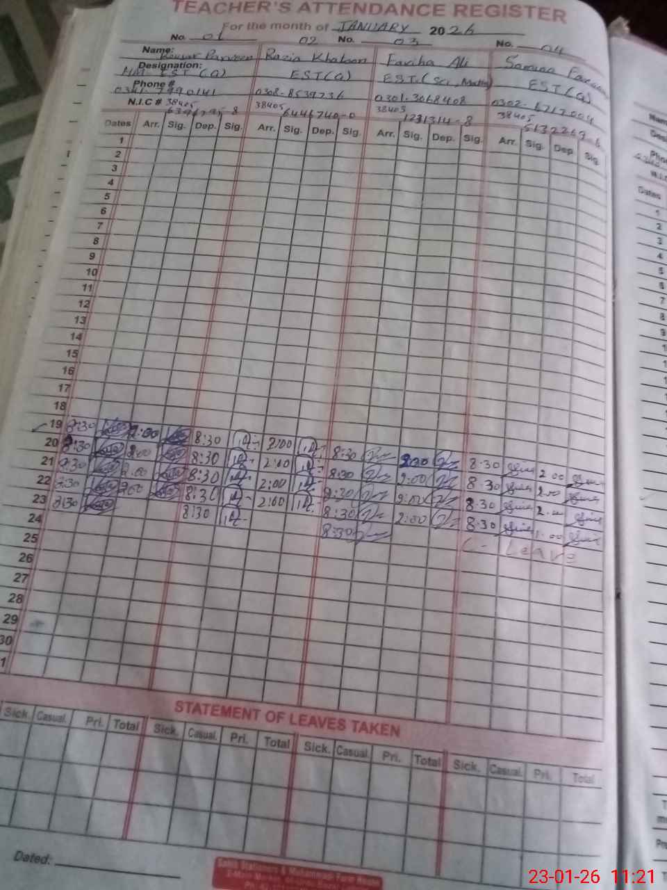 | CNIC | Full Name | Designation | R/C | Absence During Last Calender Month |