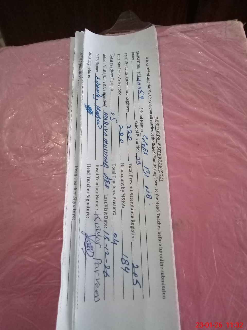 | Attendance Register | Head Teacher | MEA with School | Visit Proof |