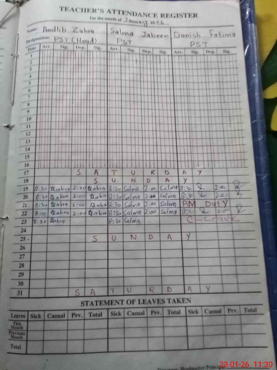 | Leave | Duty | Absent | Maternity | Medical | Ex- Pak |