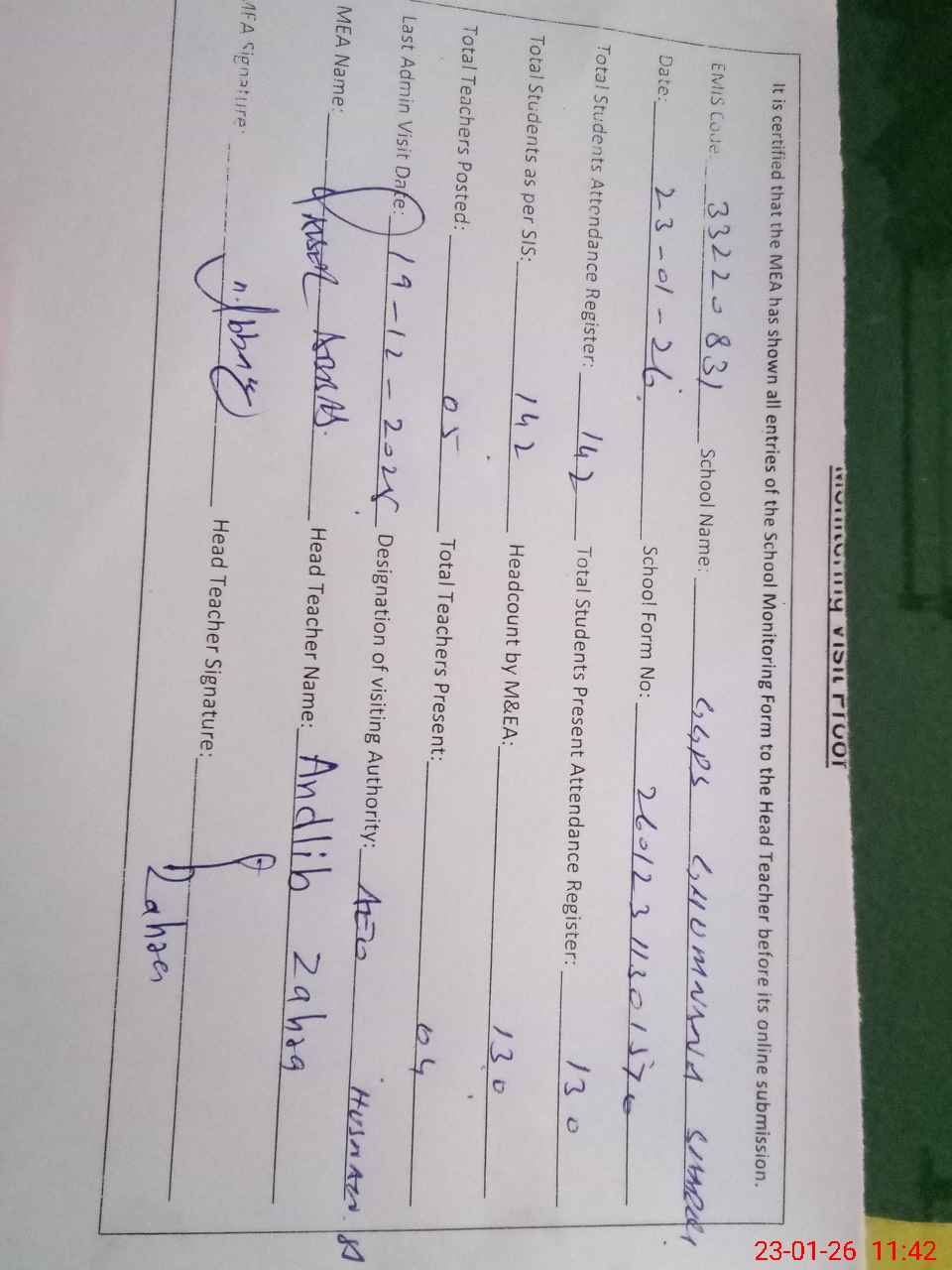 | Attendance Register | Head Teacher | MEA with School | Visit Proof |