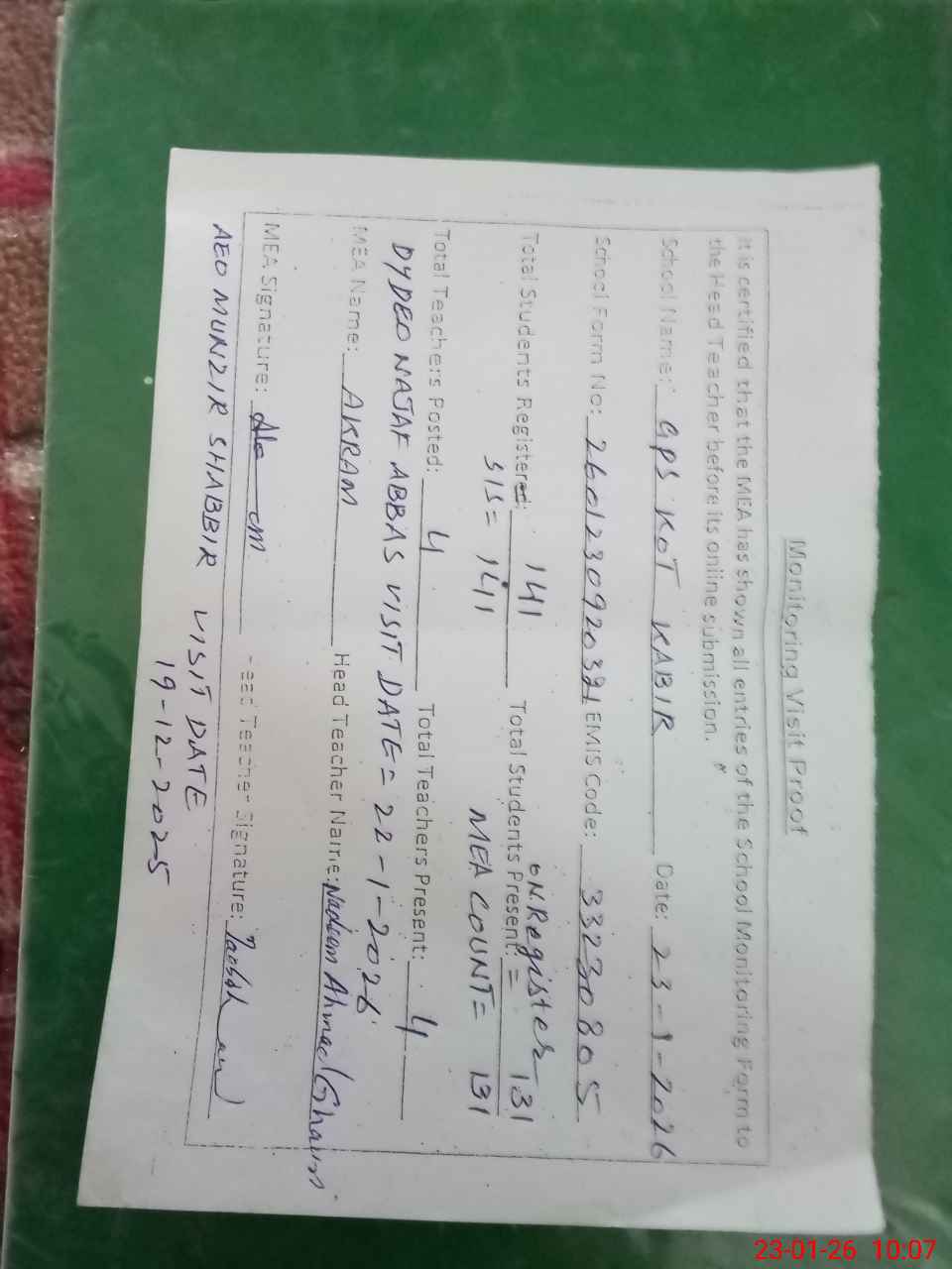 | EMIS Code: 33230805 | Name of School: GPS KOT KABIR | |||