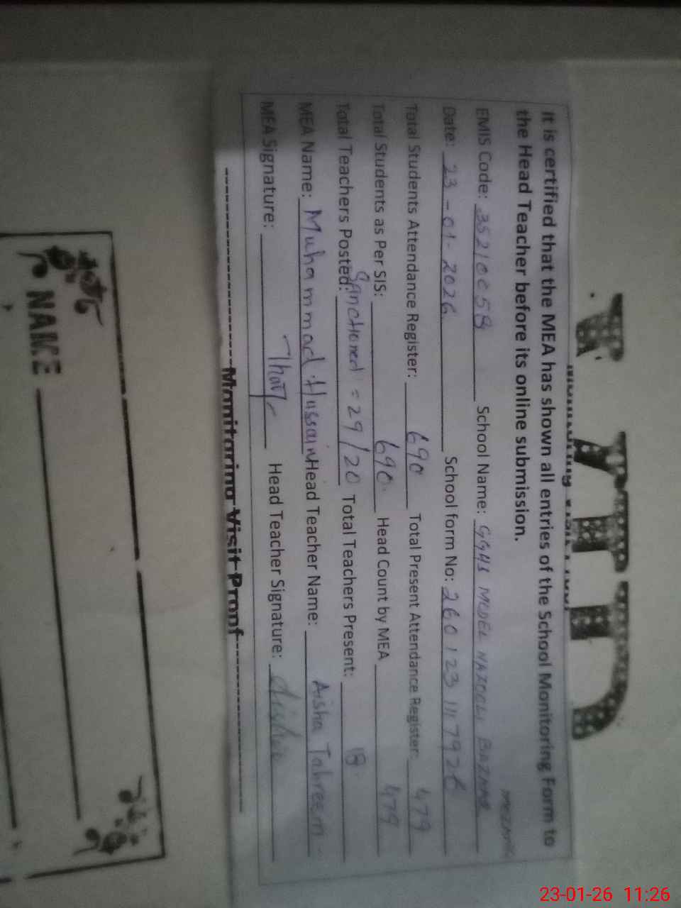 | Attendance Register | Head Teacher | MEA with School | Visit Proof |
