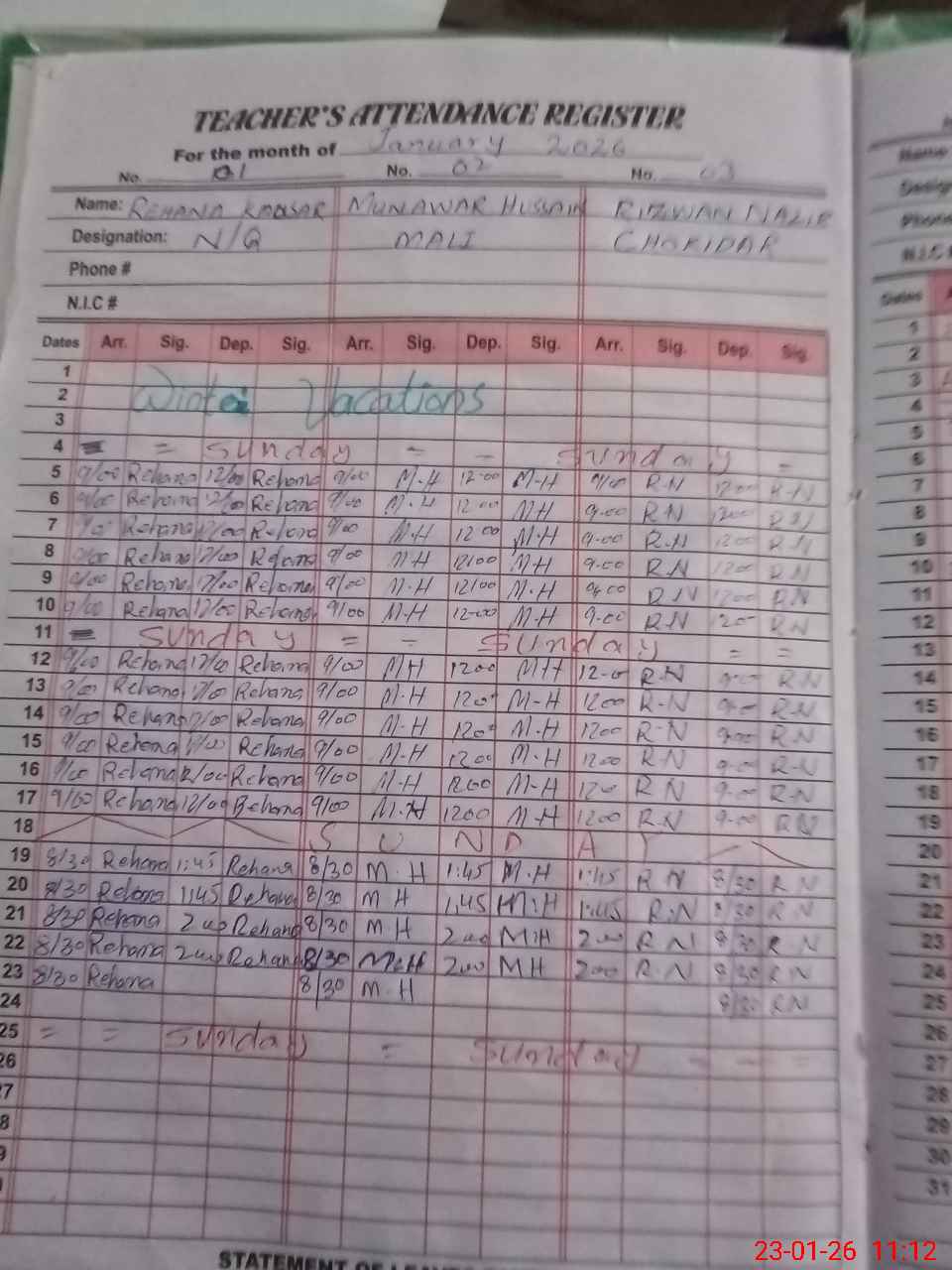 | CNIC | Full Name | Designation | R/C | Absence During Last Calender Month |