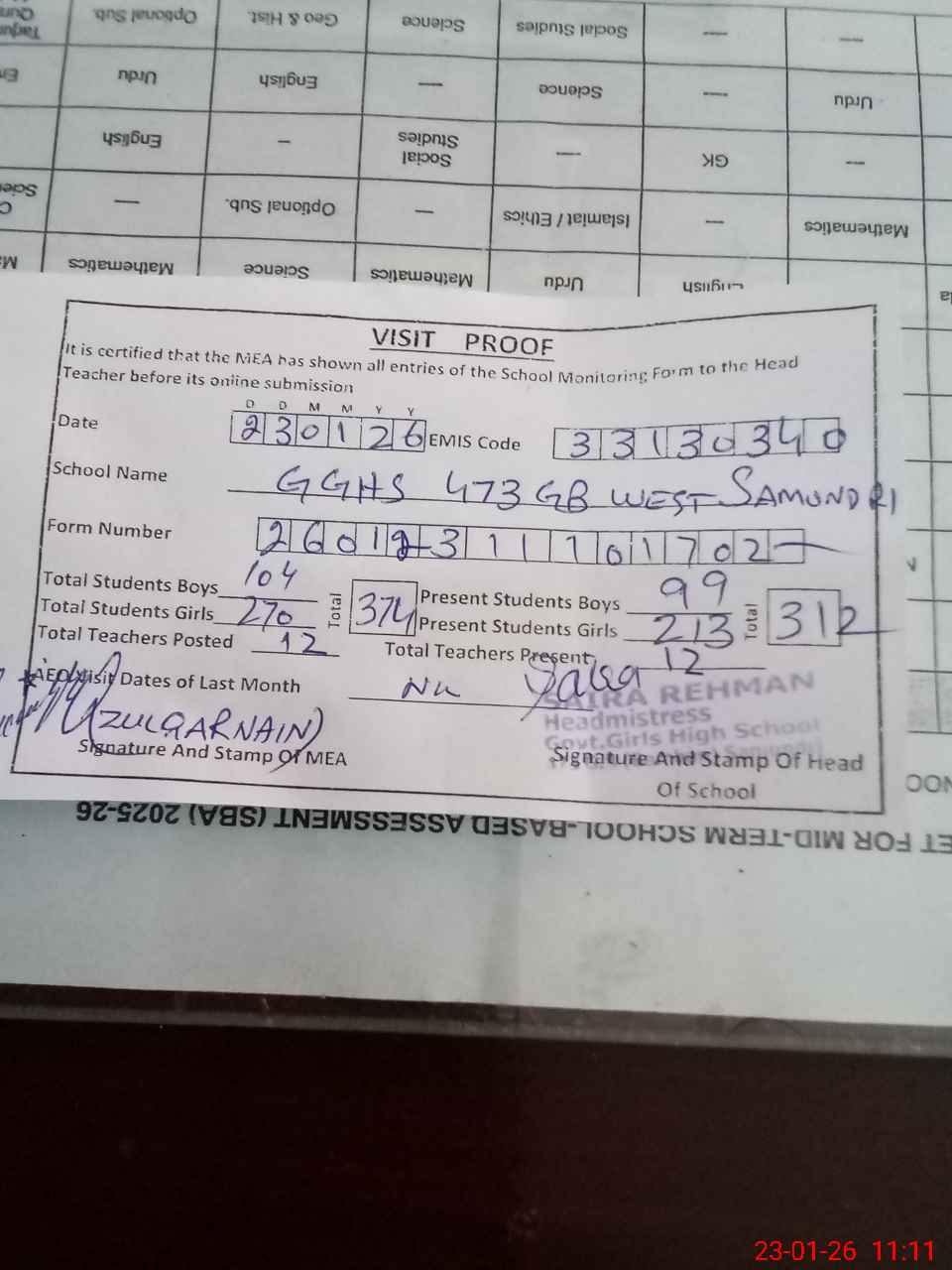 | Attendance Register | Head Teacher | MEA with School | Visit Proof |