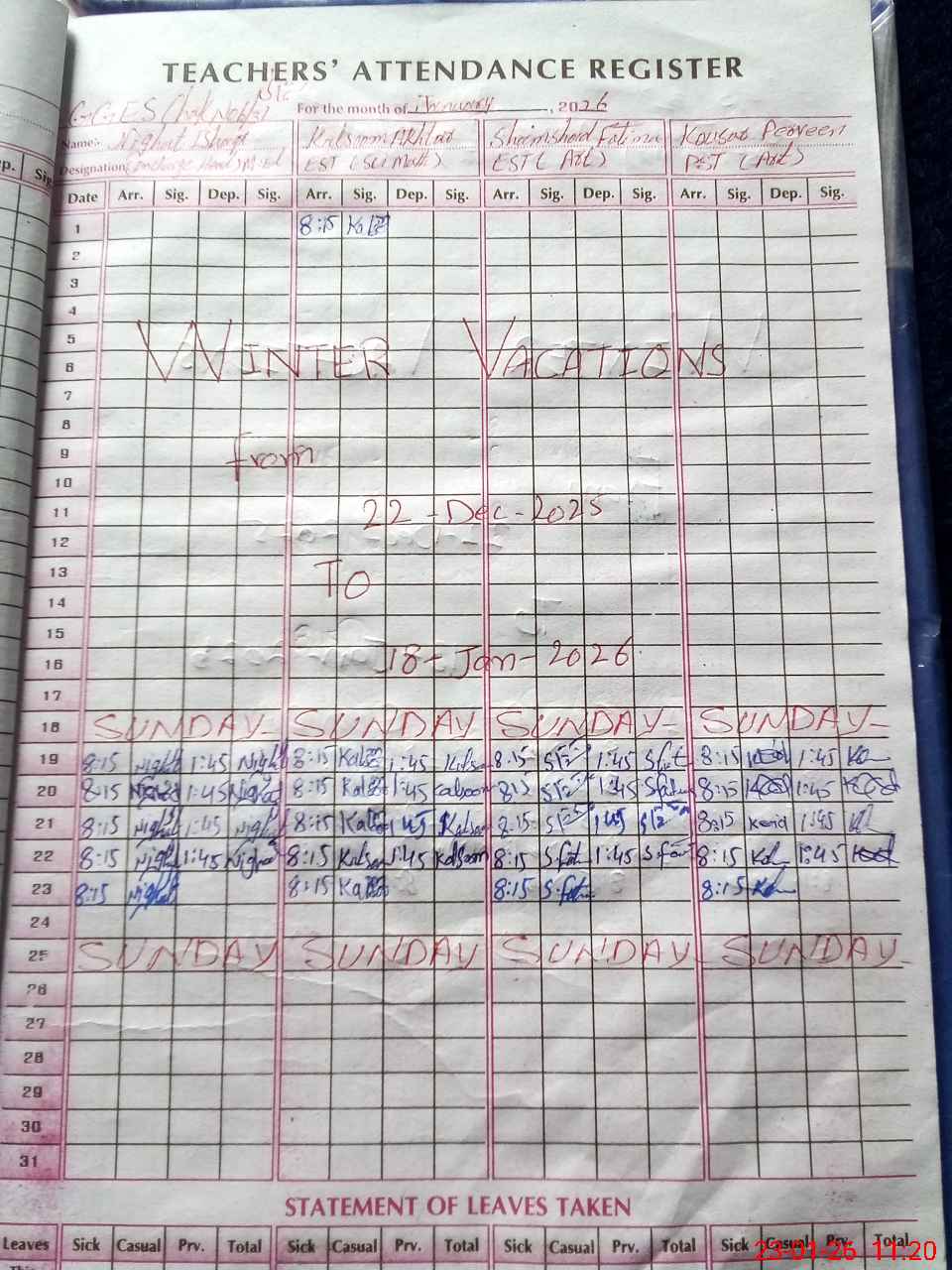 | Leave | Duty | Absent | Maternity | Medical | Ex- Pak |