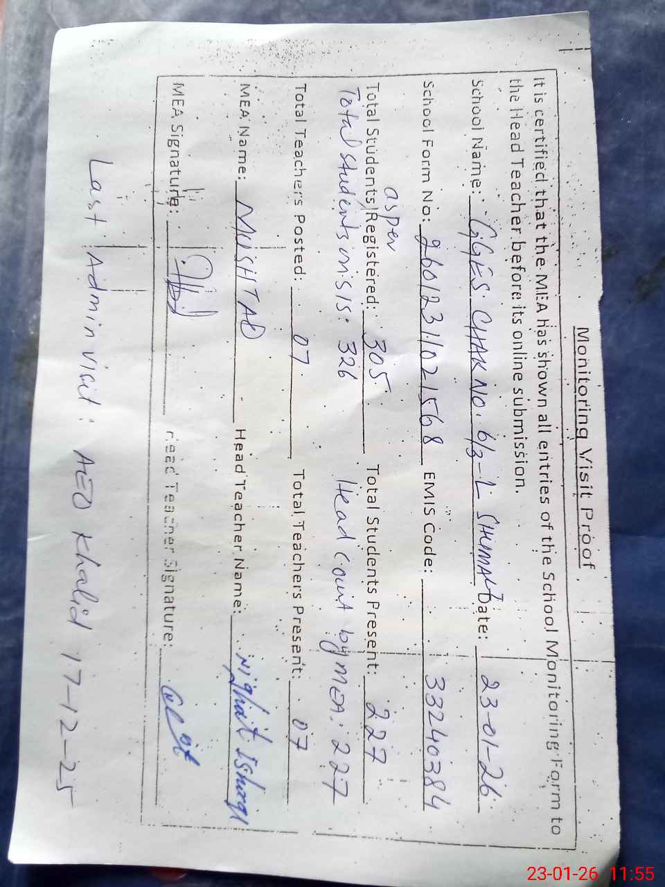 | Attendance Register | Head Teacher | MEA with School | Visit Proof |