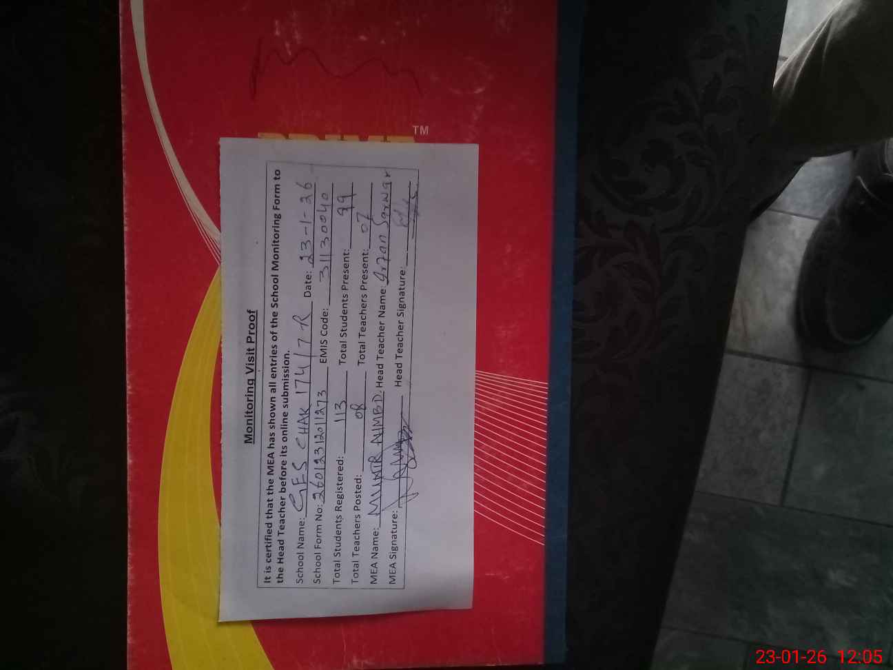 | Attendance Register | Head Teacher | MEA with School | Visit Proof |