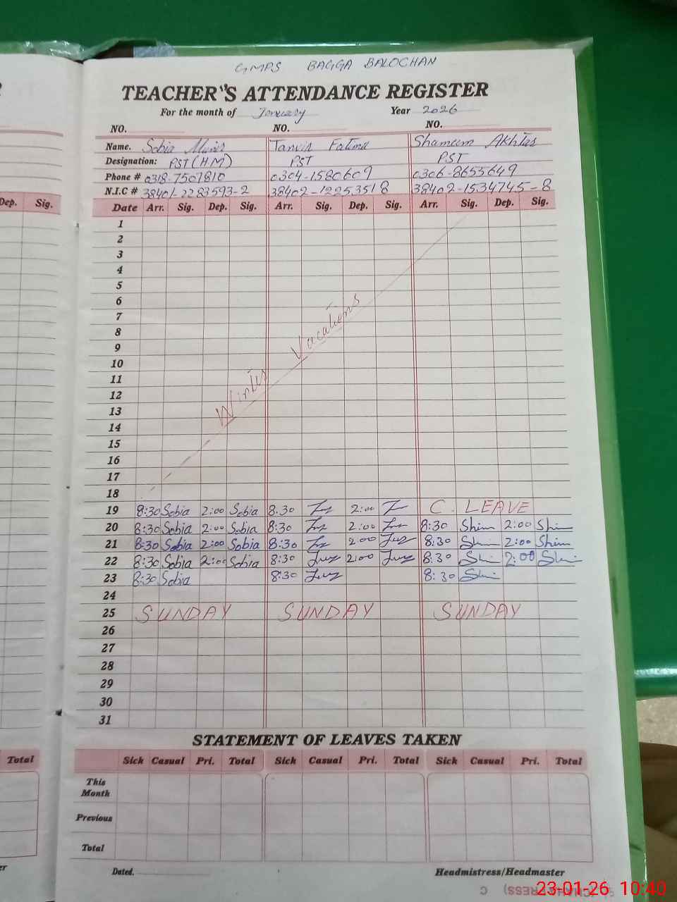 | CNIC | Full Name | Designation | R/C | Absence During Last Calender Month |