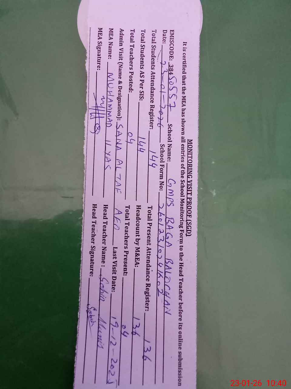 | Attendance Register | Head Teacher | MEA with School | Visit Proof |