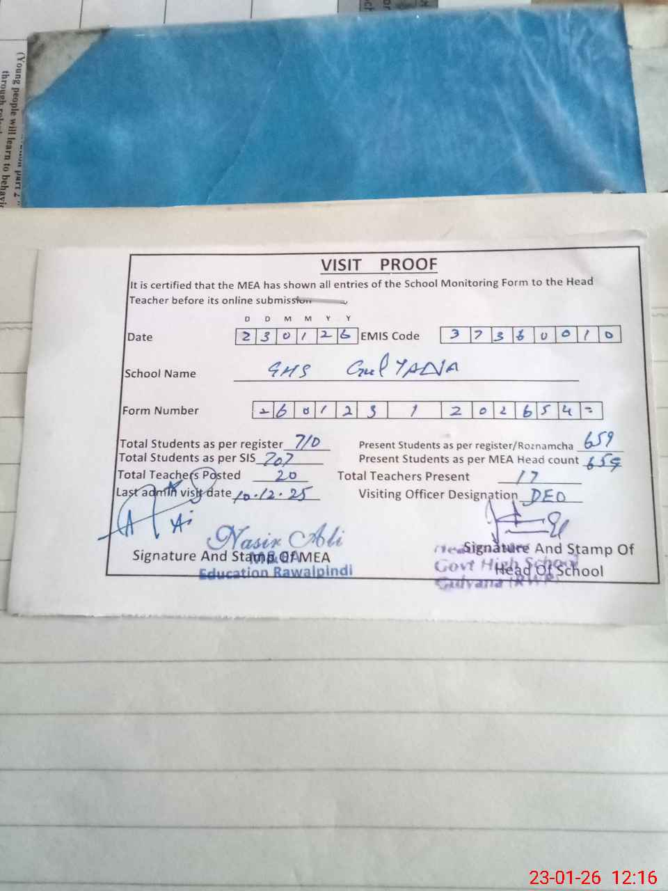 | Attendance Register | Head Teacher | MEA with School | Visit Proof |