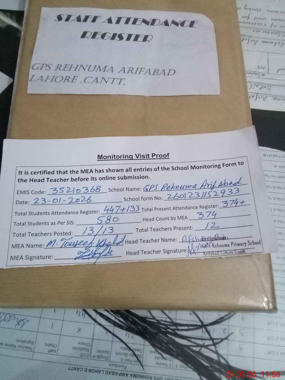 | Attendance Register | Head Teacher | MEA with School | Visit Proof |