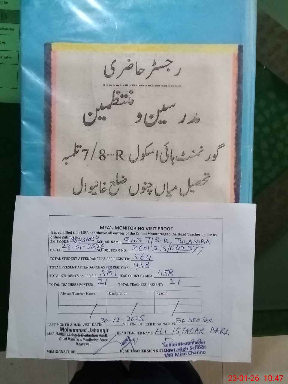 | Attendance Register | Head Teacher | MEA with School | Visit Proof |