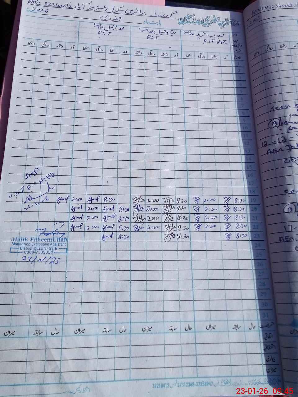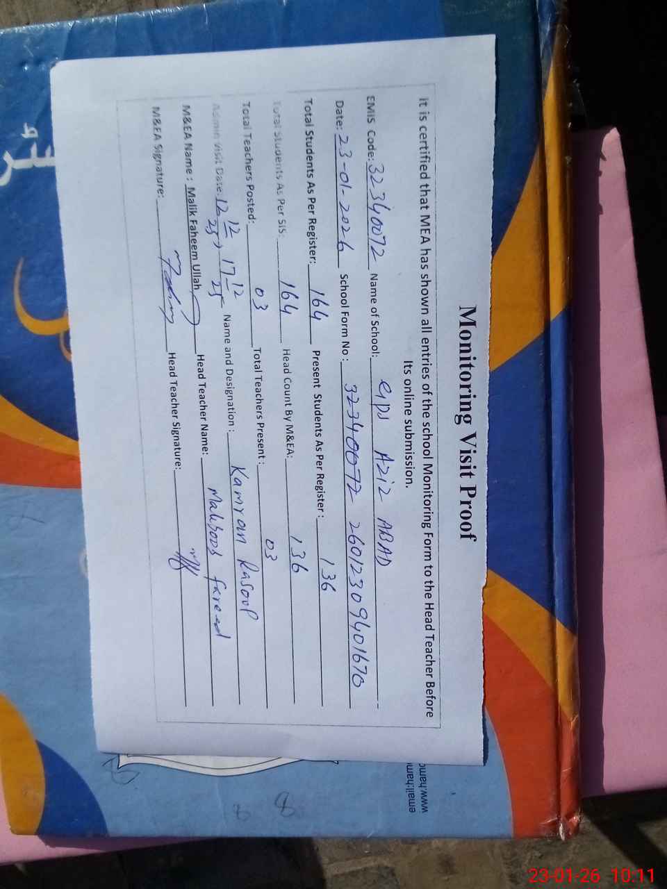 | Attendance Register | Head Teacher | MEA with School | Visit Proof |