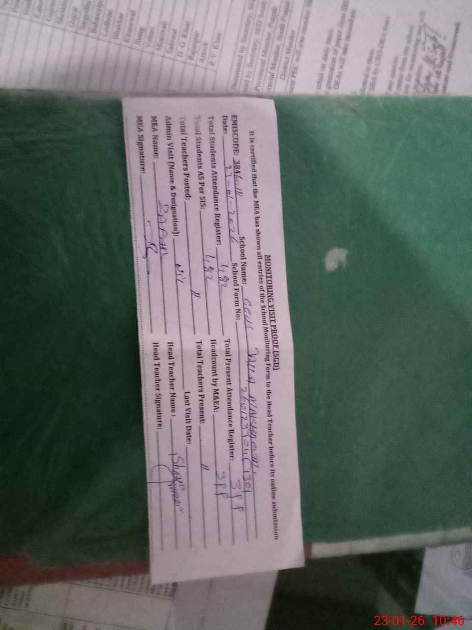 | Attendance Register | Head Teacher | MEA with School | Visit Proof |