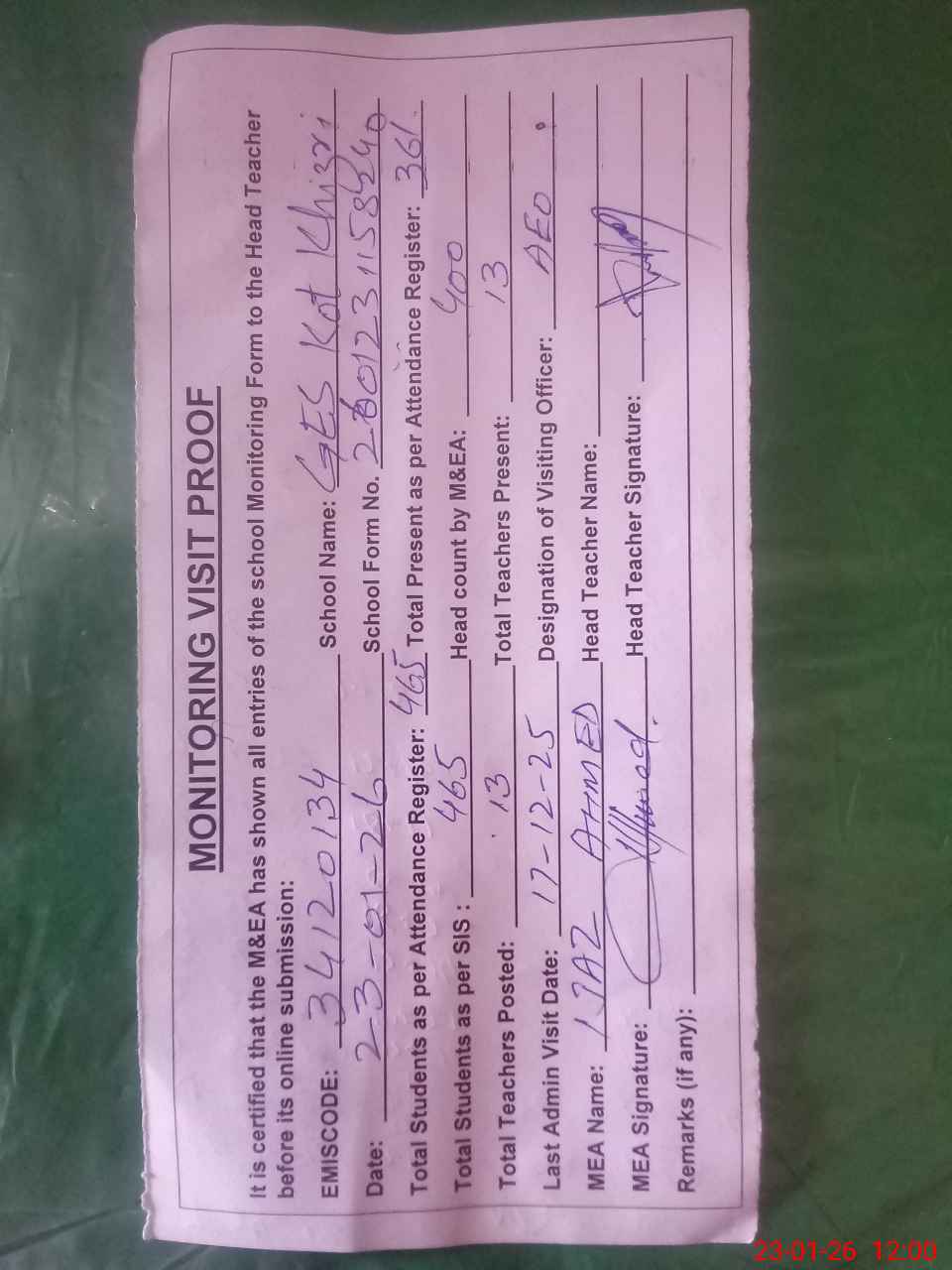 | Attendance Register | Head Teacher | MEA with School | Visit Proof |