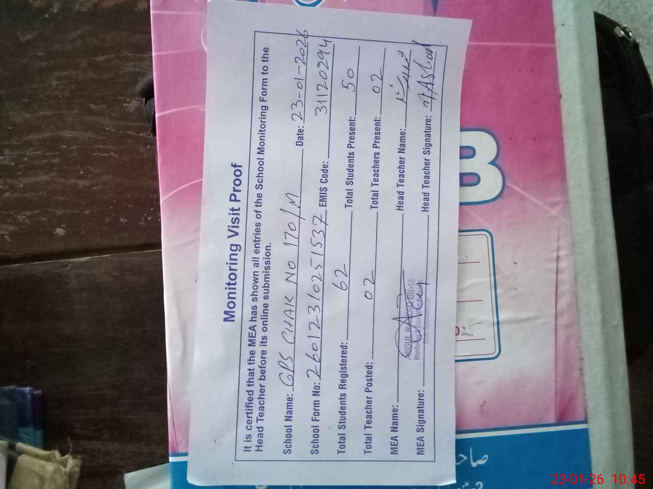 | Attendance Register | Head Teacher | MEA with School | Visit Proof |
