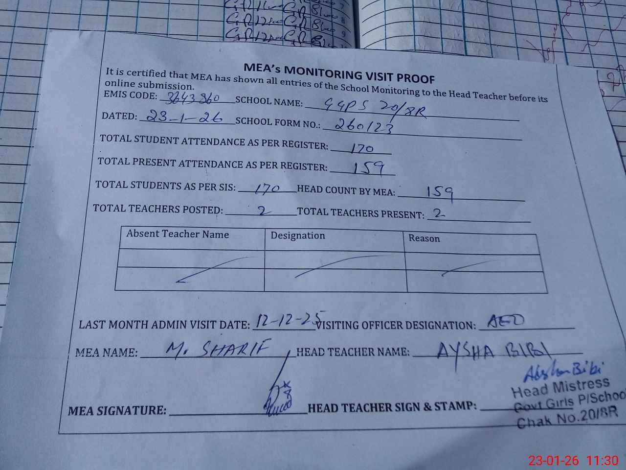 | Attendance Register | Head Teacher | MEA with School | Visit Proof |