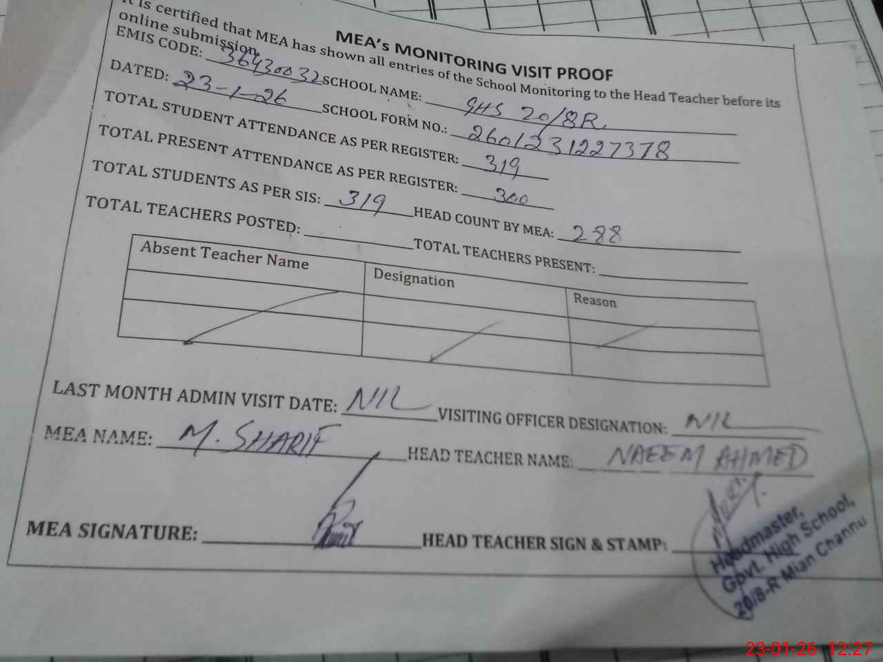 | Attendance Register | Head Teacher | MEA with School | Visit Proof |