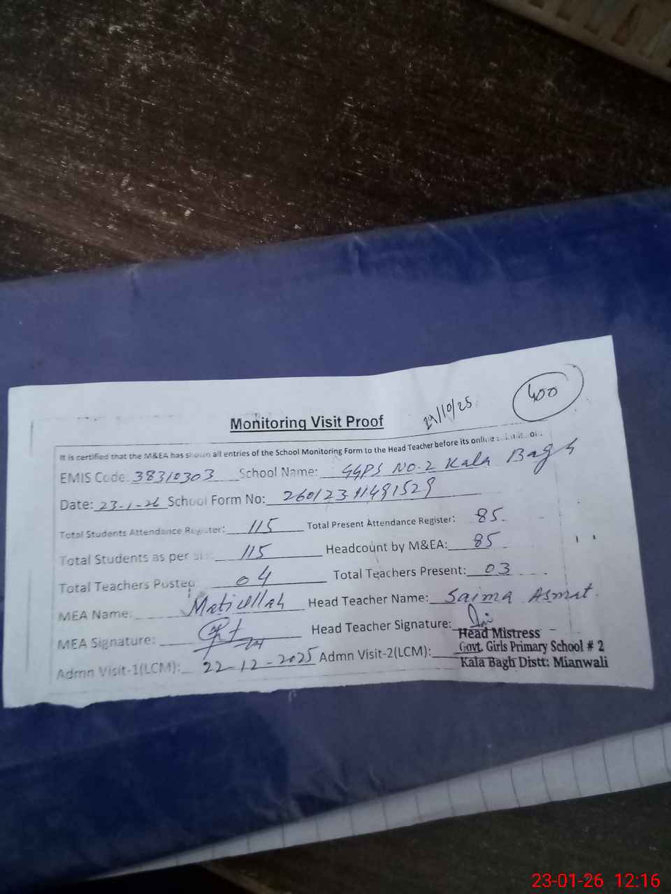 | EMIS Code: 38310303 | Name of School: GGPS NO. 2 KALA BAGH | |||
