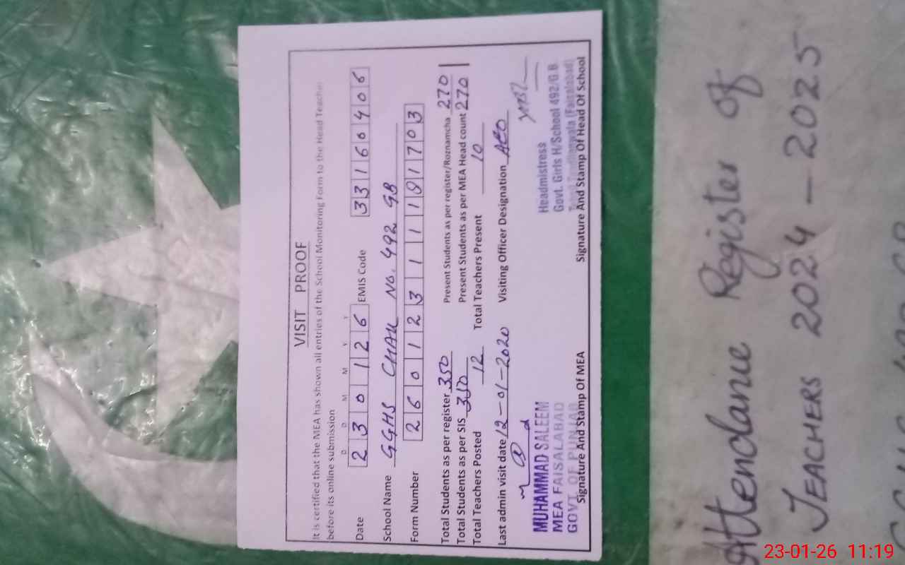 | Attendance Register | Head Teacher | MEA with School | Visit Proof |