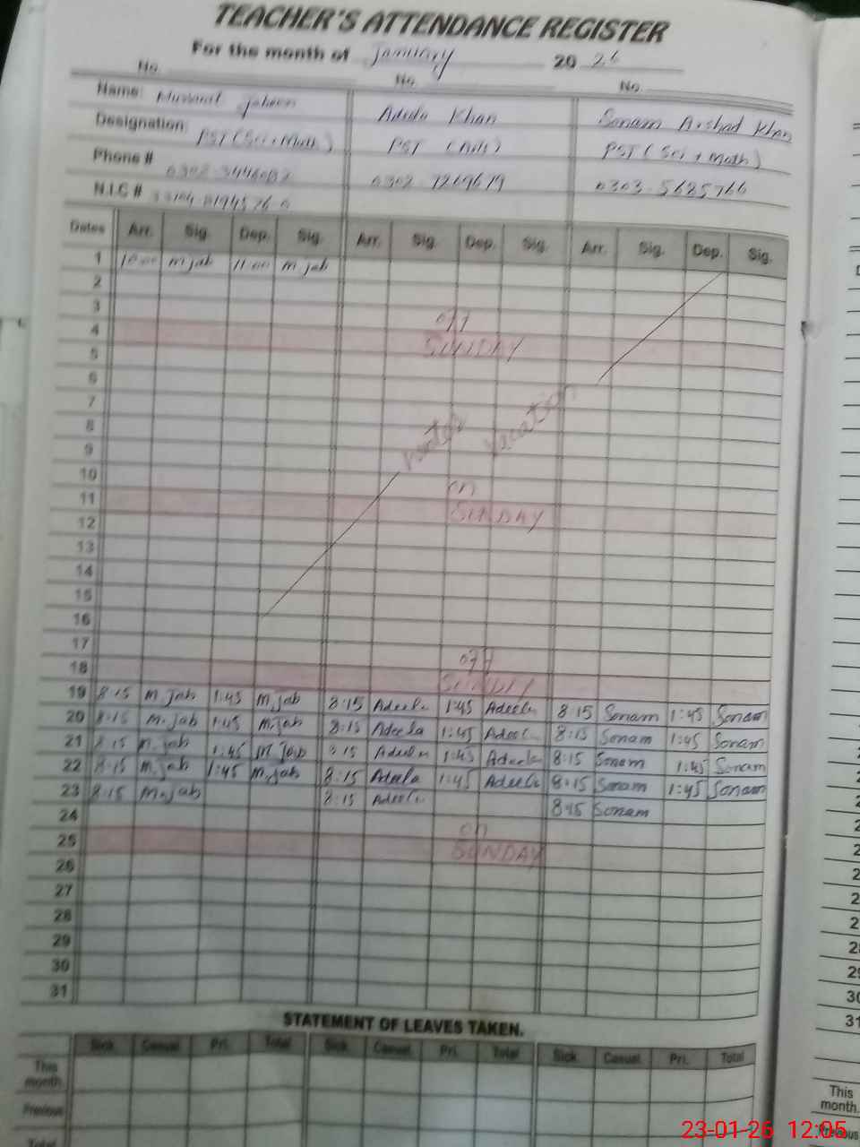 | CNIC | Full Name | Designation | R/C | Absence During Last Calender Month |