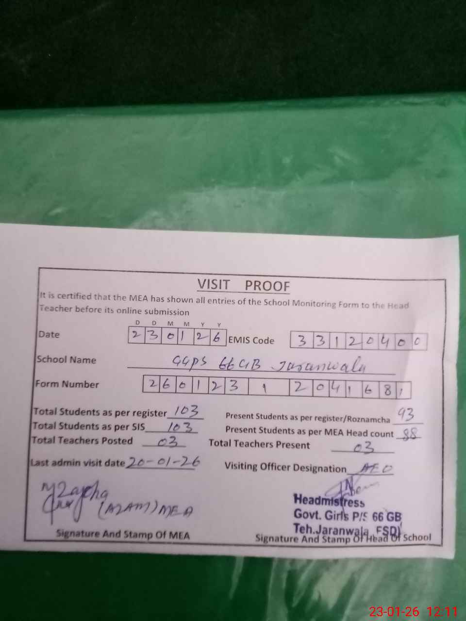 | Attendance Register | Head Teacher | MEA with School | Visit Proof |