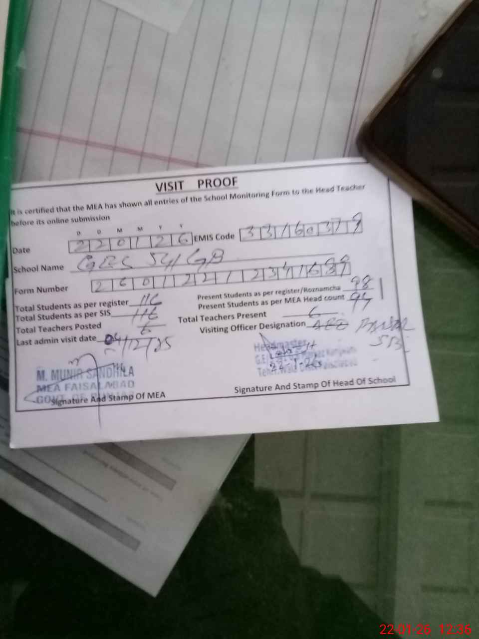 | Attendance Register | Head Teacher | MEA with School | Visit Proof |