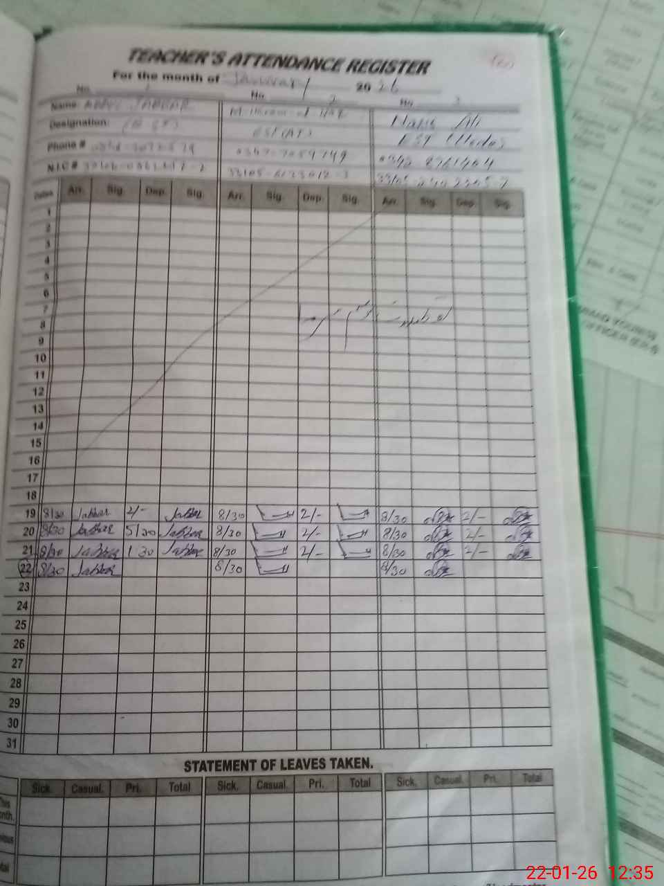 | CNIC | Full Name | Designation | R/C | Absence during last cal. month |